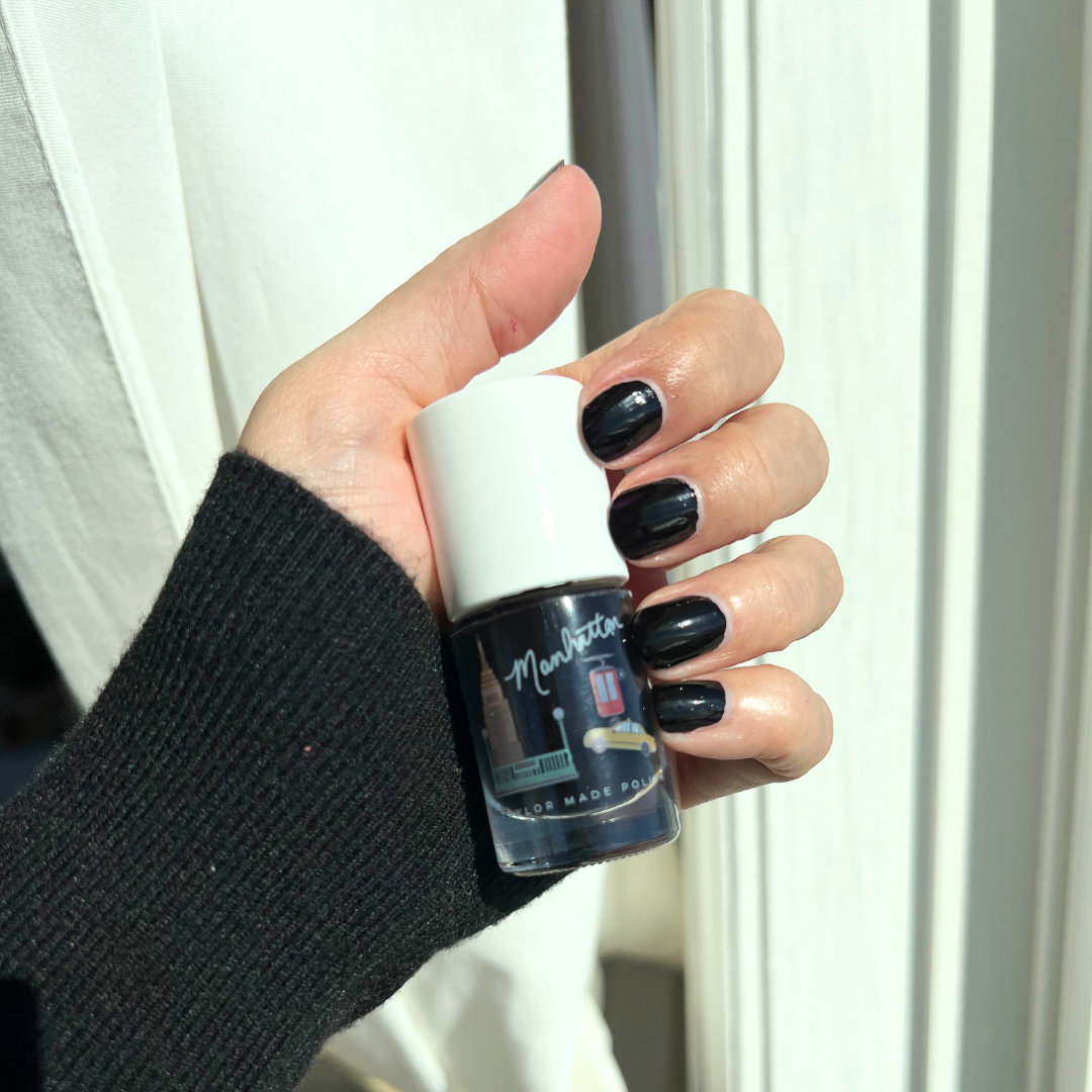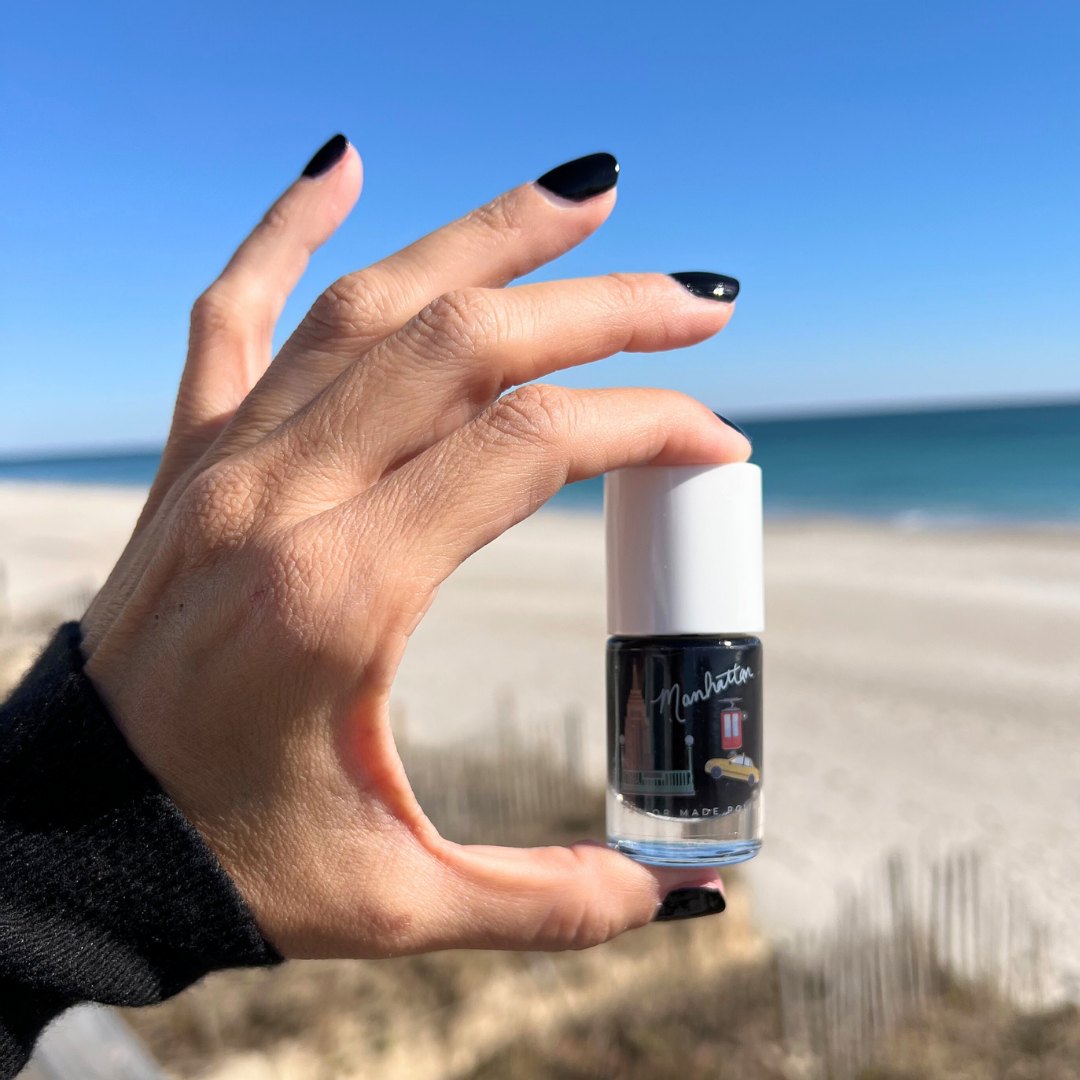 Bold, glossy graphite with deep dark purple undertones and ONE-COAT coverage. The front bottle artwork shows a playful taxi, tram and subway graphics. This shade embodies the fast-paced energy of the city and quick formula that keeps up with your hustle.